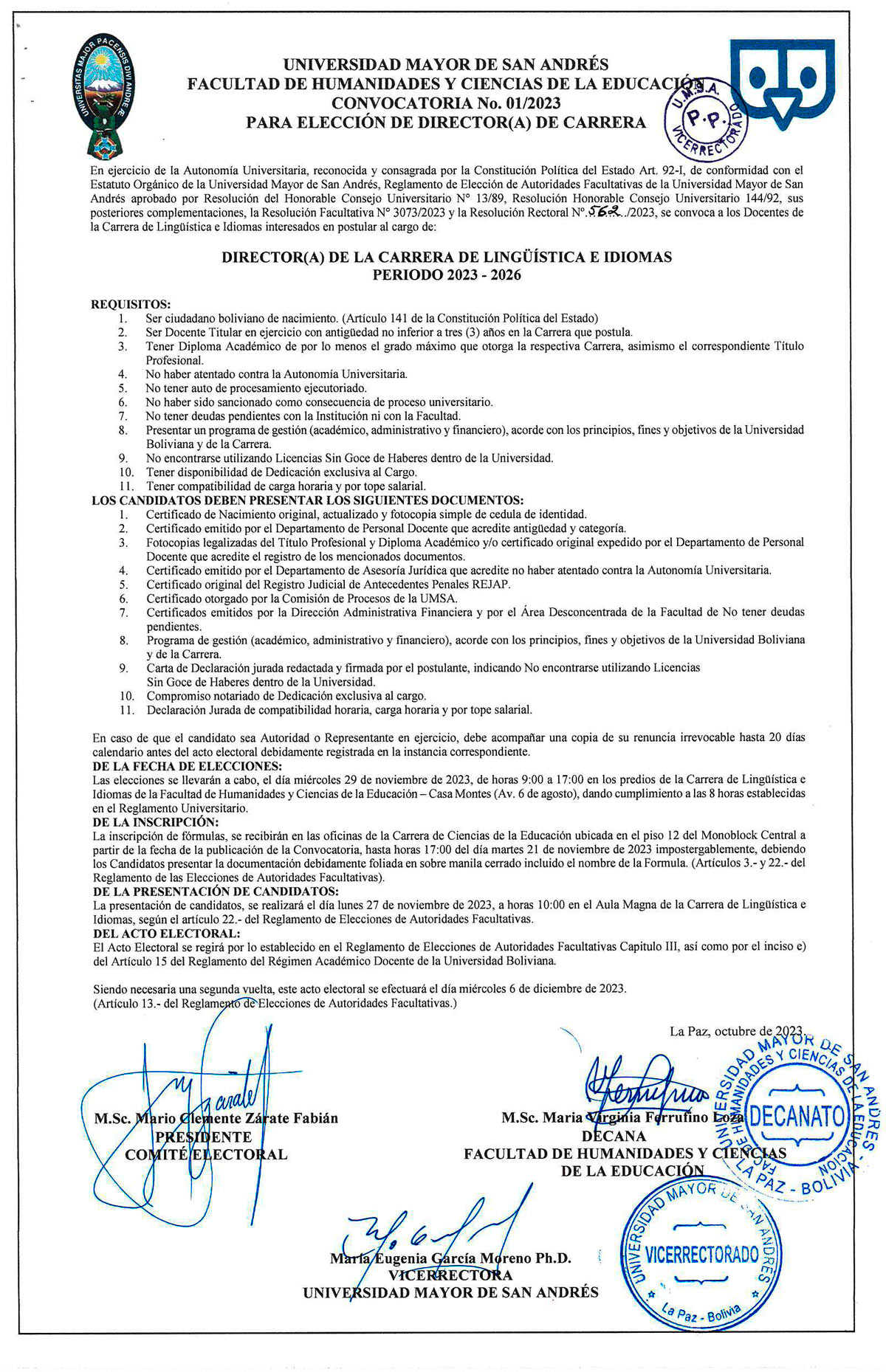 CONVOCATORIA DIRECTOR (A) DE LA CARRERA DE LINGÜÍSTICA E IDIOMAS <br> (PERIODO 2023 – 2026).