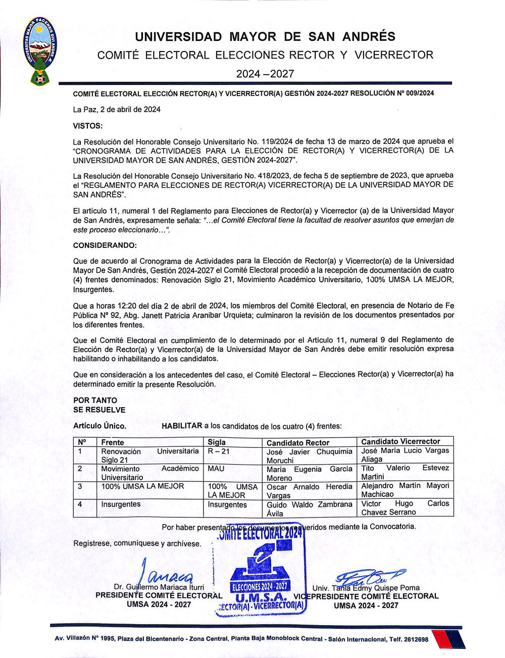 HABILITADOS LOS CANDIDATOS DE LOS CUATRO (4) FRENTES <br> ELECCIÓN DE RECTOR(A) Y VICERRECTOR(A) GESTIÓN 2024-2027